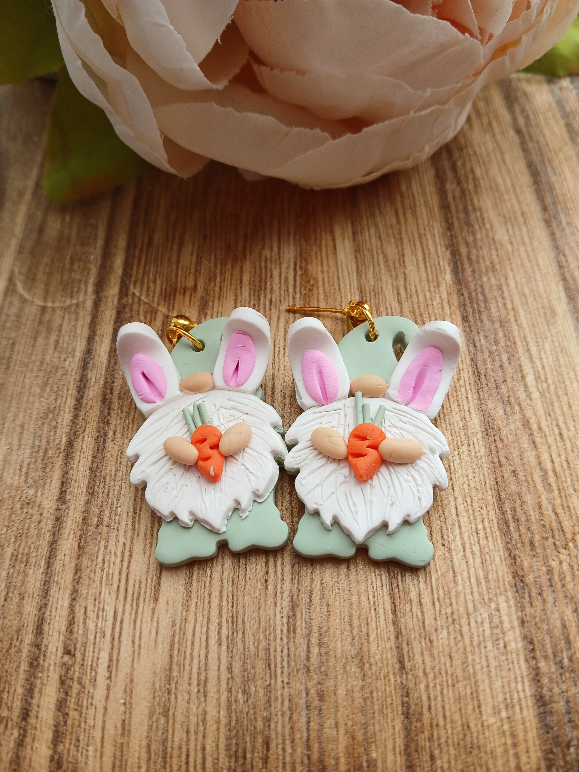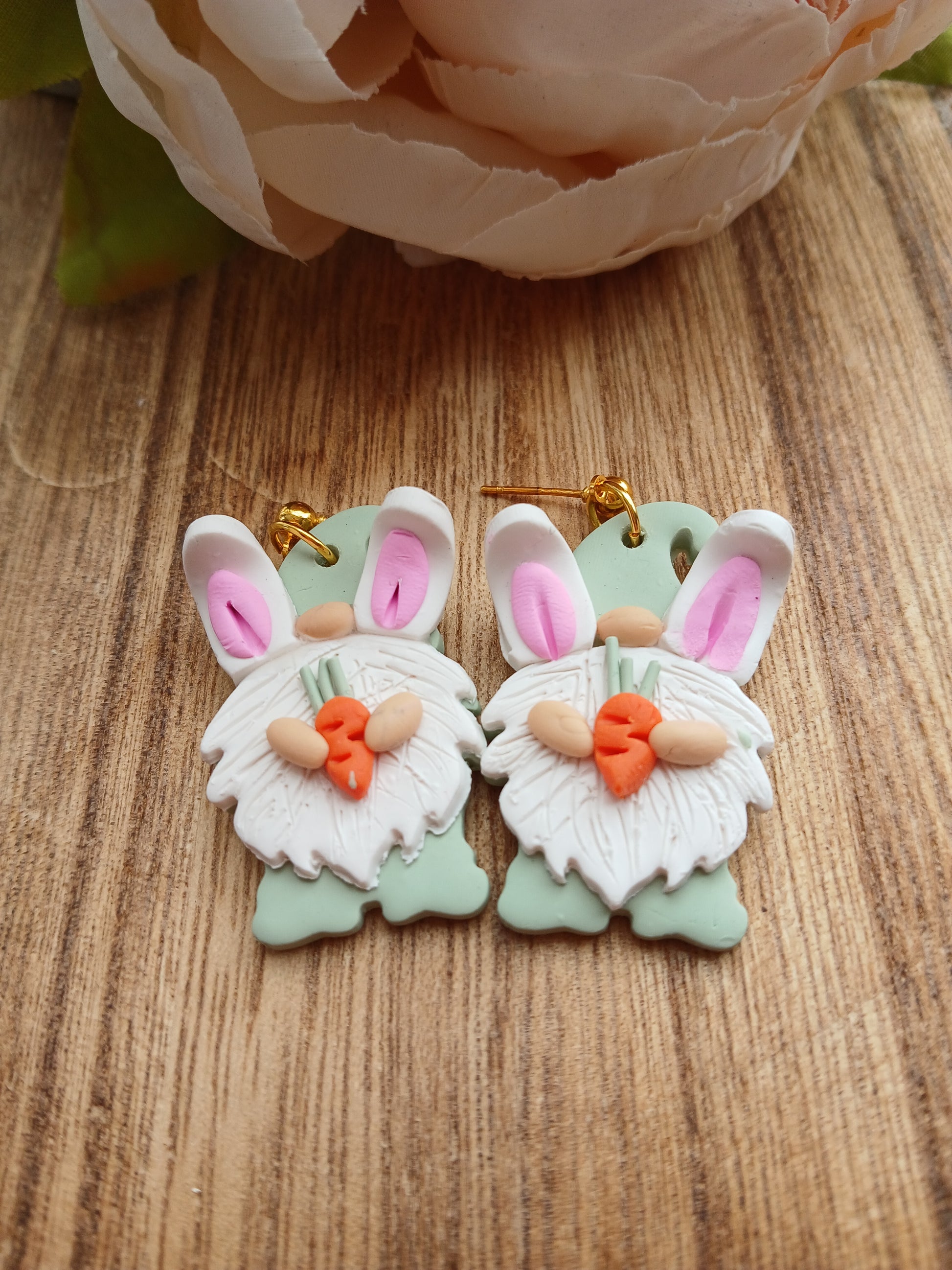 These adorable handmade earrings feature a charming gnome and bunny design, crafted from vibrant polymer clay. Perfect for adding a touch of whimsy and springtime cheer to your outfit. Lightweight and unique, these earrings bring a playful and handmade feel to any look.