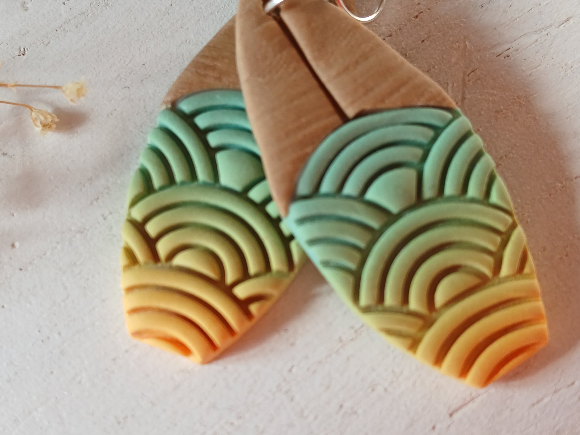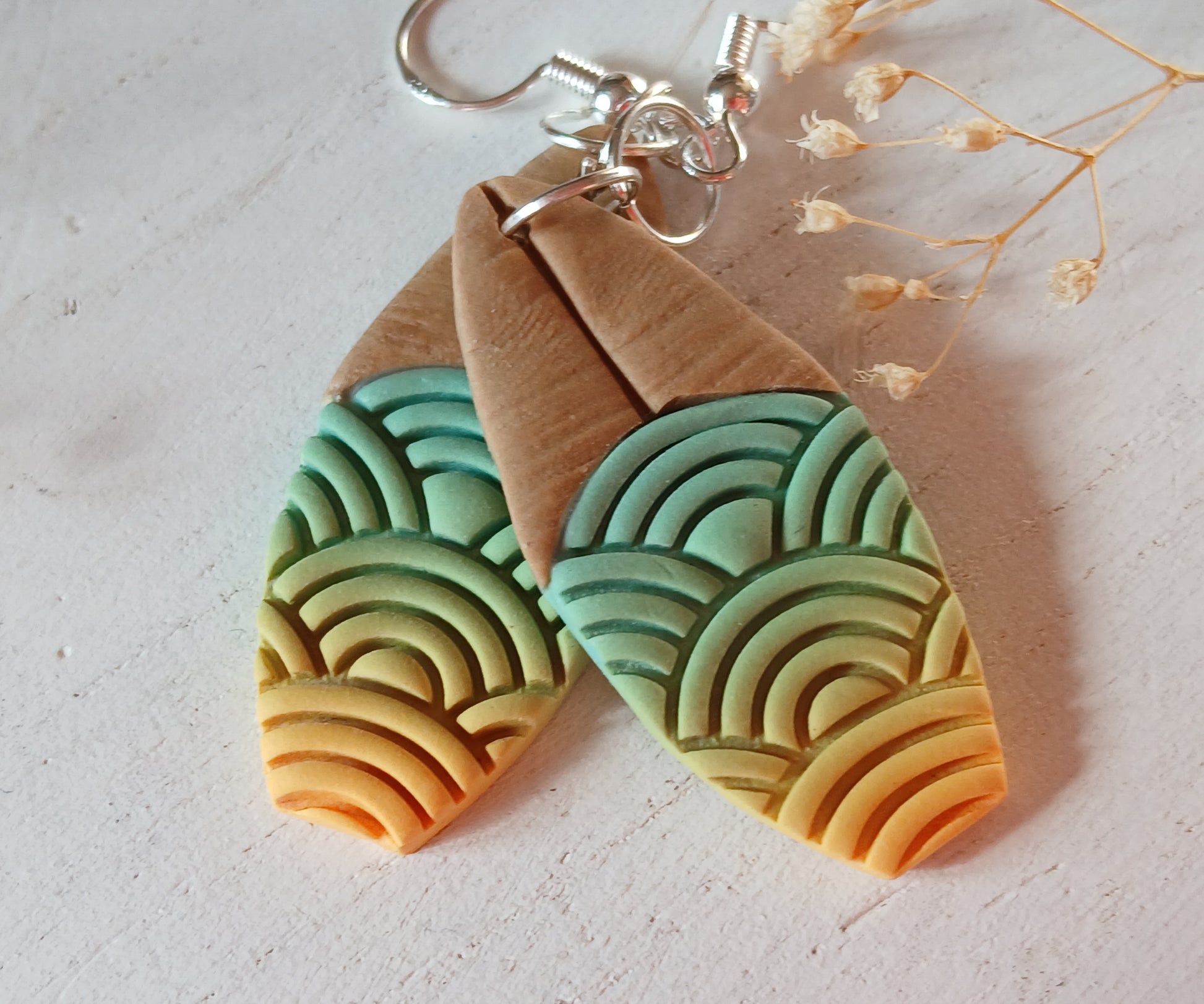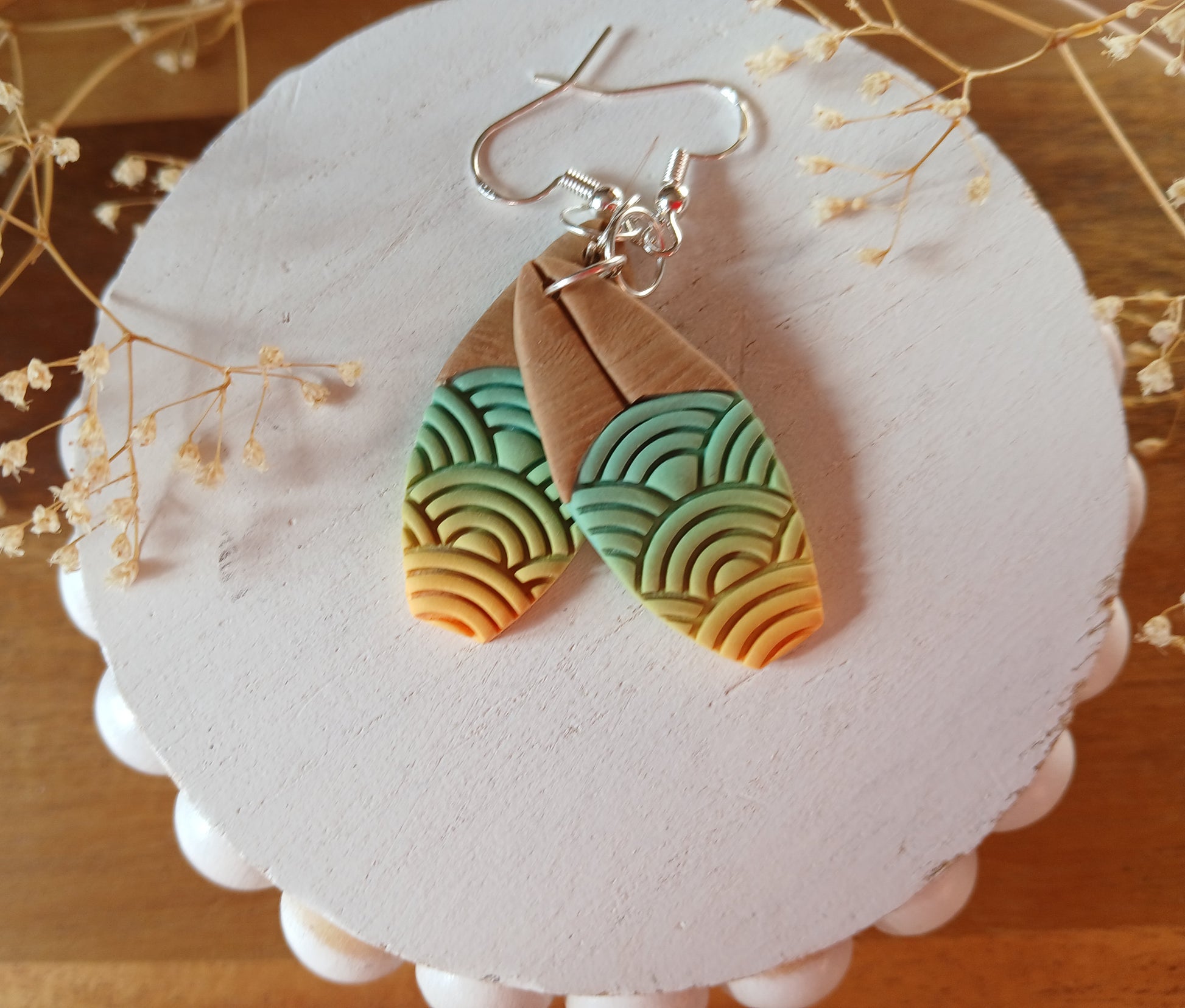 Ride the island breeze with these handcrafted Tropical Surfboard Dangle Earrings. Each piece features a warm wood-grain top that flows into an intricate ombré blend of tropical blue, yellow, and green, creating a vivid beach-inspired pattern. Finished on sleek silver hooks, these lightweight dangles bring a splash of coastal color and adventure to any outfit.