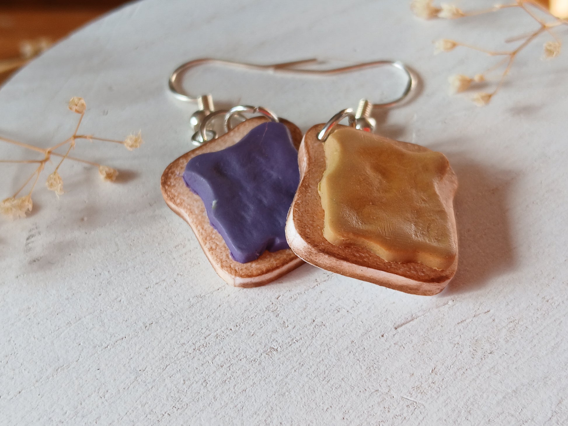 Serve up a little nostalgia with these handcrafted PB&J Bread Slice Dangle Earrings! One slice features creamy peanut butter, the other a layer of jelly—each sculpted with charming detail and hung from sleek silver hooks. Playful, lightweight, and irresistibly fun, they’re the perfect pair for food lovers and anyone who adores a touch of whimsy.