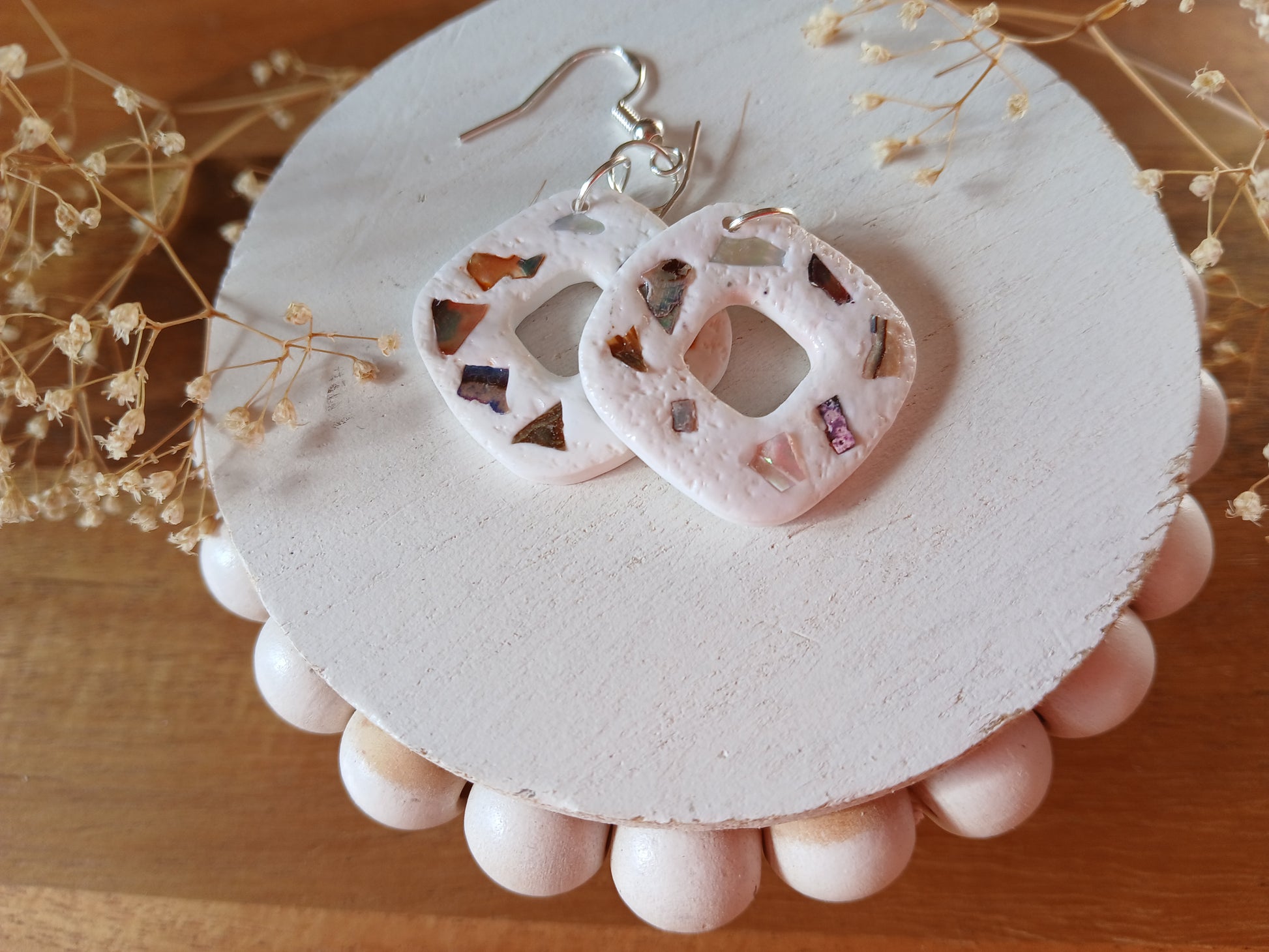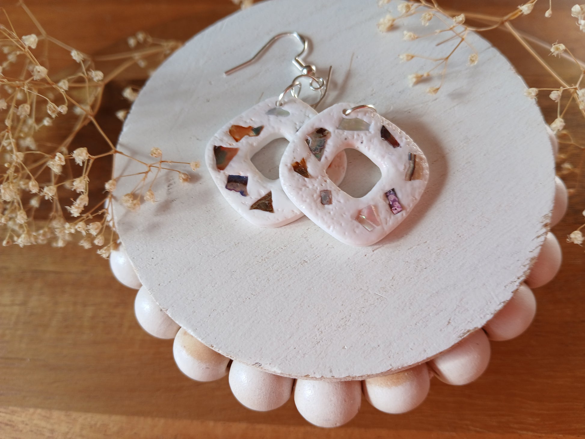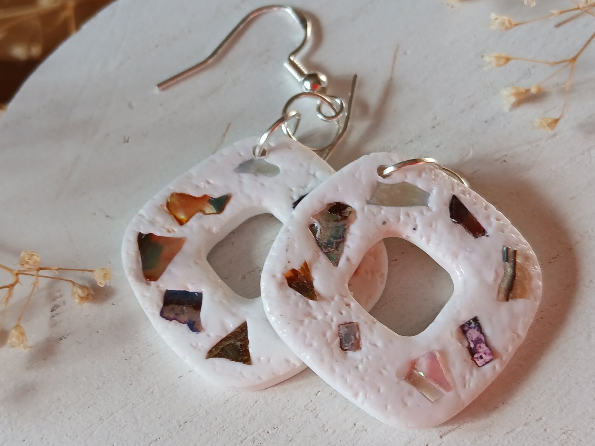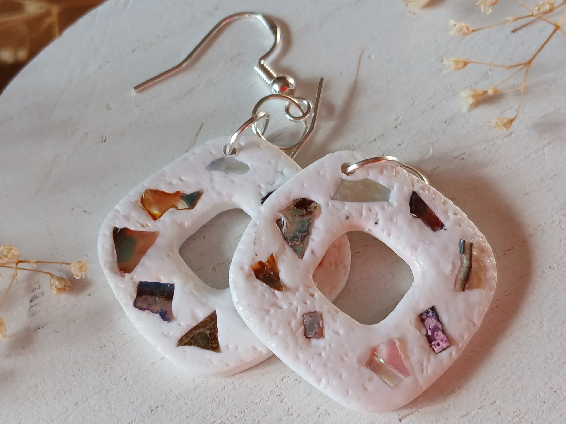 Bring coastal warmth to your style with these handcrafted square dangle earrings, featuring a soft white base and a cutout center for a modern, airy look. Each piece is inlaid with shimmering abalone shells in various iridescent hues, adding natural texture and color to the clay design. Finished with sleek silver hooks, these cozy, ocean-inspired dangles offer a beautiful blend of elegance, texture, and seaside charm.