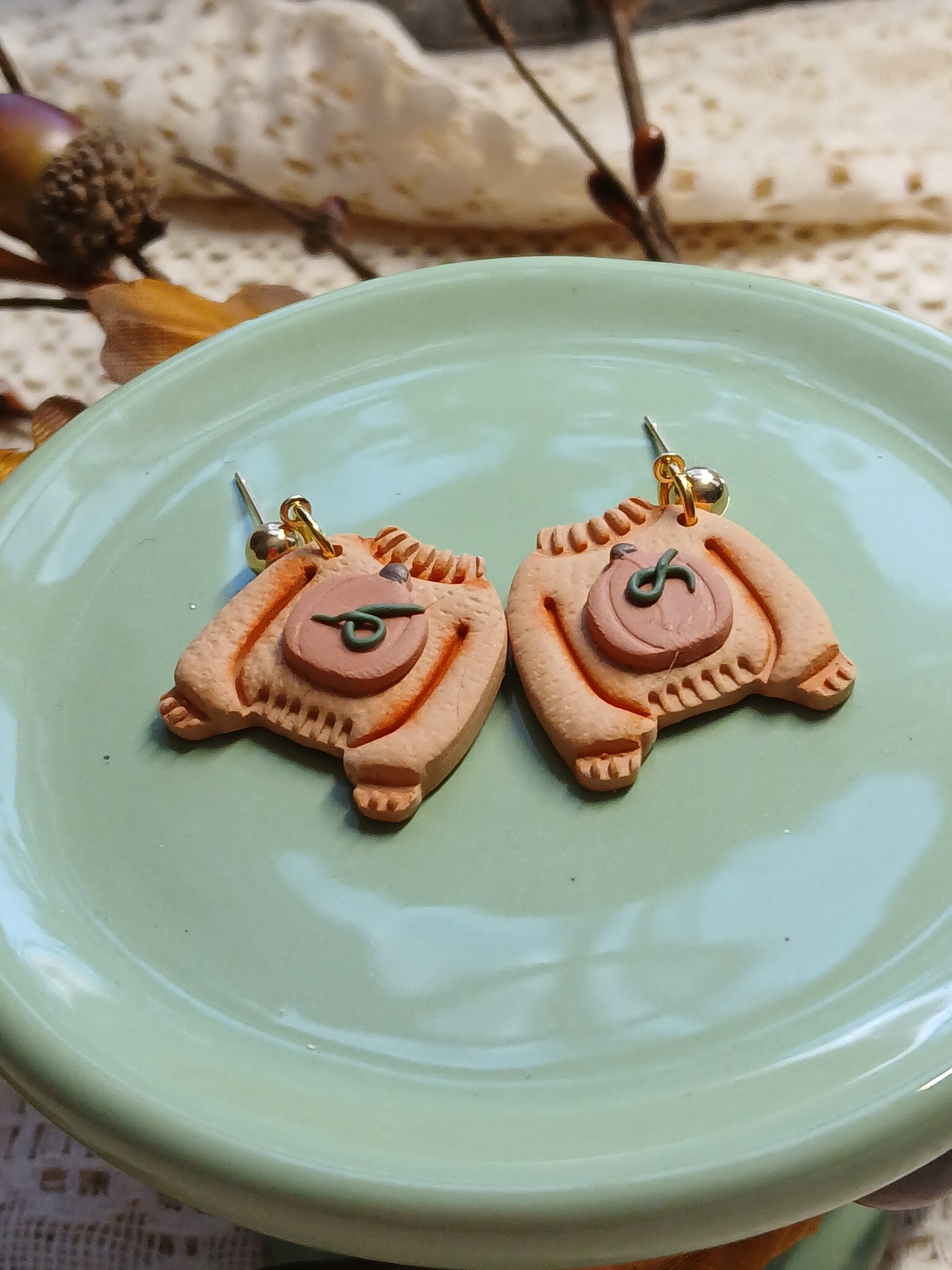 These charming handmade earrings capture the heart of autumn with cozy camel-colored sweaters adorned with a muted orange pumpkin, complete with a brown stem and soft green vine. Set on elegant gold ball posts, they bring a touch of fall warmth and artisan charm to any outfit. Lightweight, hypoallergenic, and crafted with care — the perfect piece for sweater weather days.
